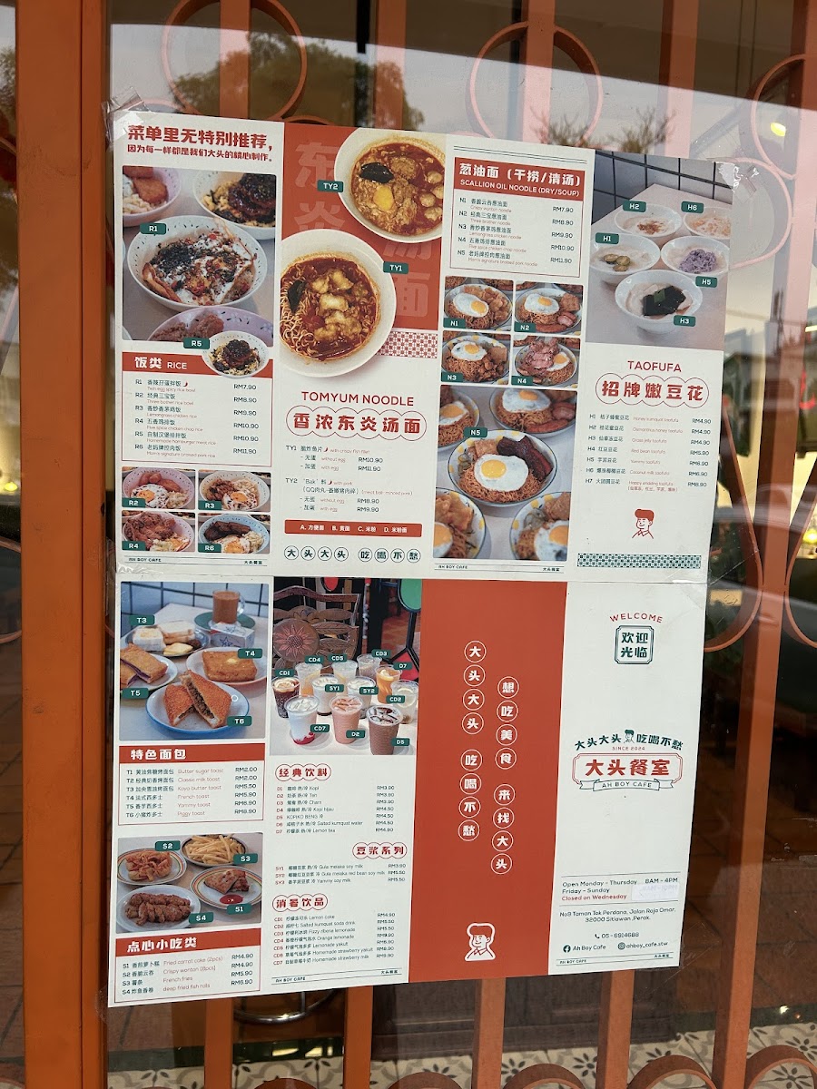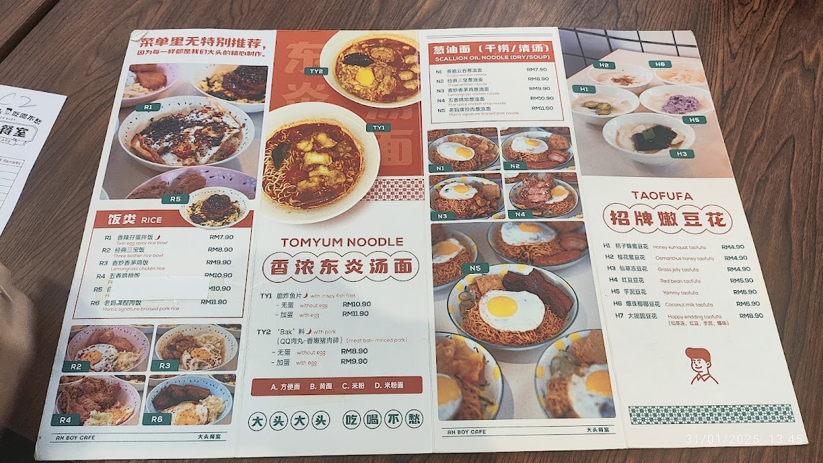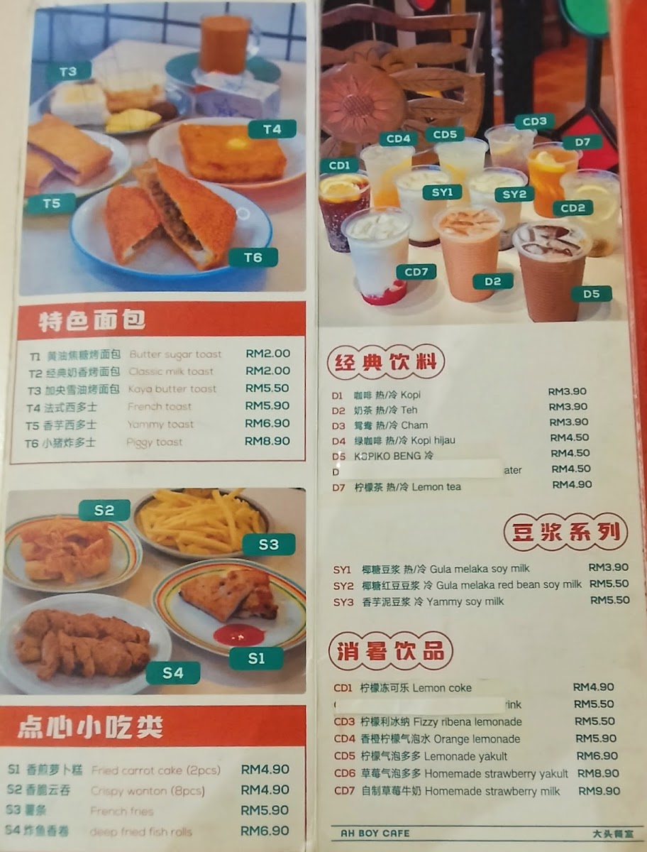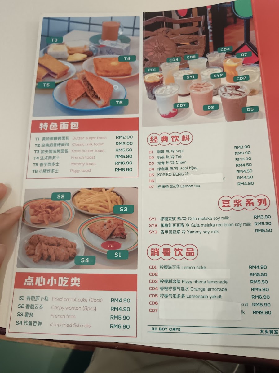The menu offers a variety of food and beverage options suitable for casual dining, light meals, or coffee breaks. It features a selection of traditional and fusion cafe items, including hot and cold beverages, light bites, and main dishes commonly found in a local kopitiam-style setting.